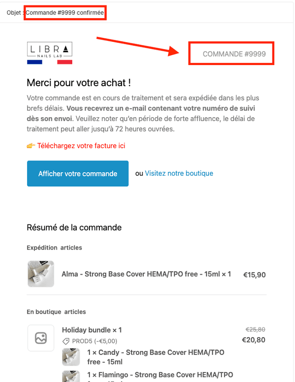 Lors de votre achat, vous recevez un e-mail de confirmation de commande. Votre numéro de commande se trouve dans cet e-mail de confirmation.